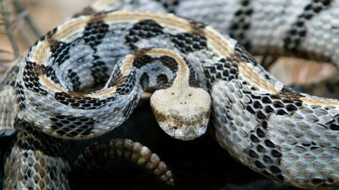 While you might be intrigued by Massasauga’s brown blotches on the gray ground and keeled scales, its venom is very toxic.